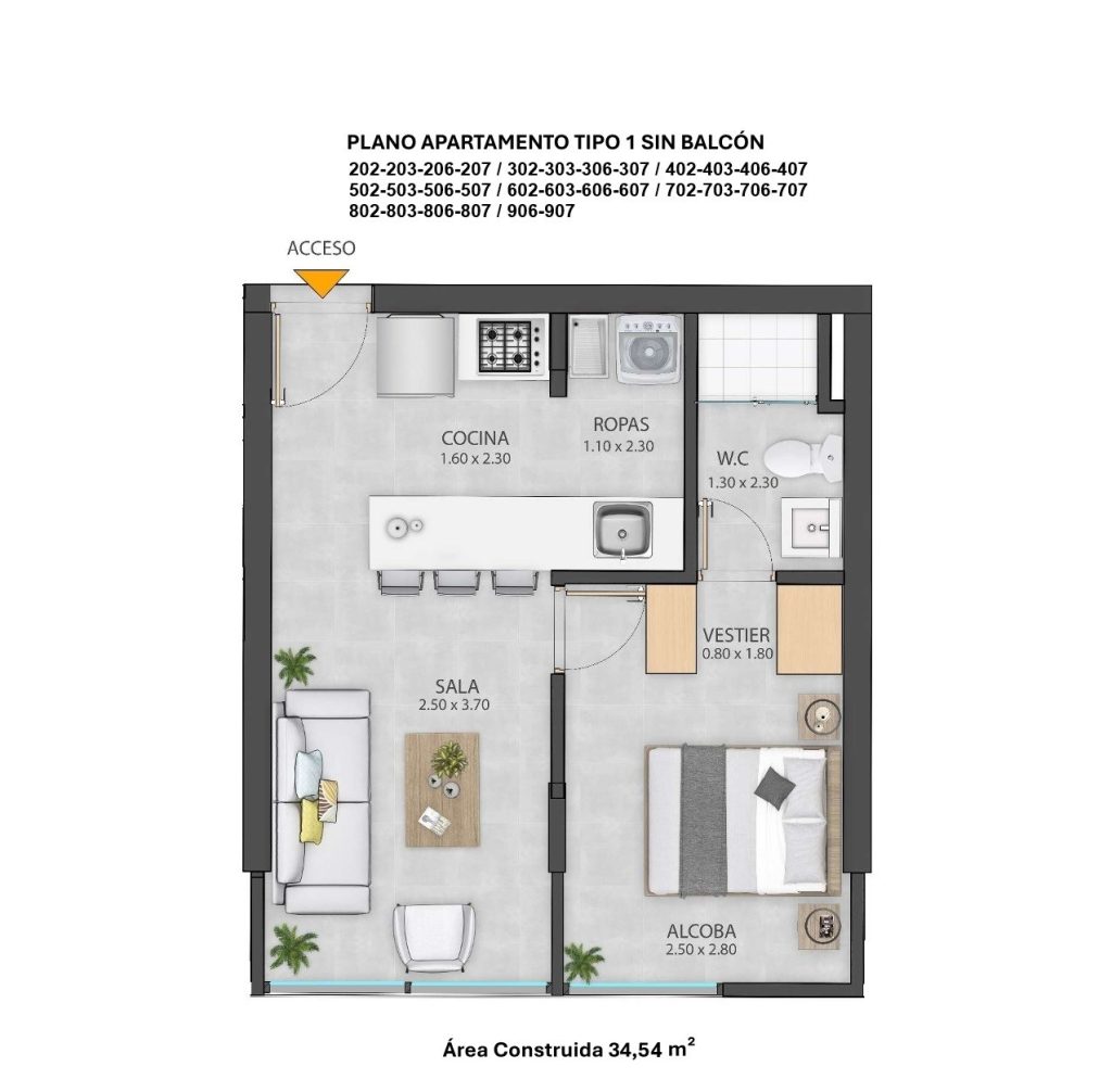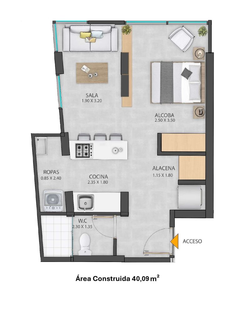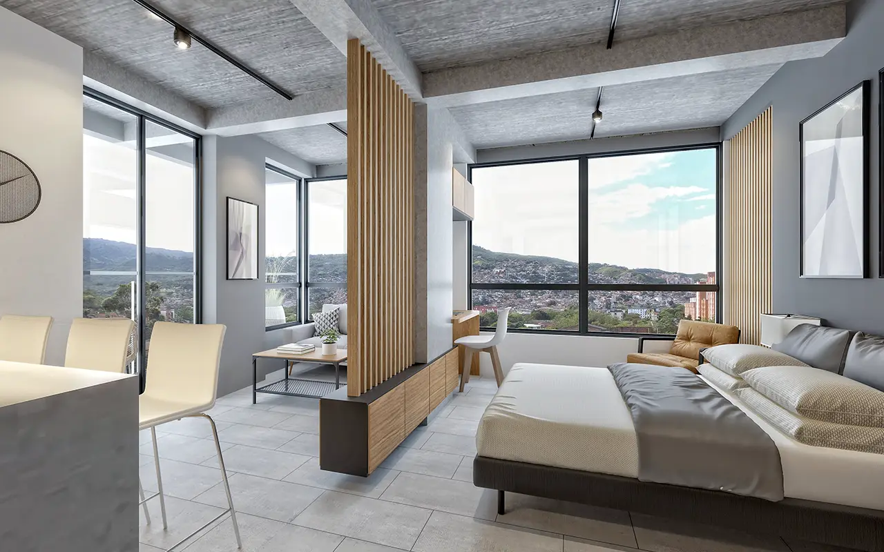 Incluye cocina y zona de servicios compacta, baño completo y un ambiente multifuncional que integra habitación y sala con separación arquitectónica para mayor confort y privacidad.